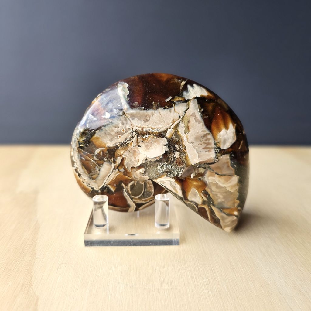 When these creatures sank to the ocean floor, the slow alchemy of fossilisation began. Minerals such as calcite, aragonite, and silica replaced the original shell, forming opalised layers that now shimmer with subtle rainbow tones. Polishing reveals their perfect curvature and intricate chambers , each one a record of the Fibonacci sequence, the golden ratio that defines balance and beauty across all creation.
