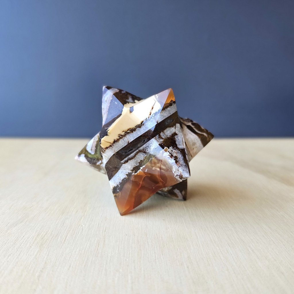 This Jasper and Carnelian Merkaba carries a steady, centred energy with a warm, earthy undertone. The Jasper brings grounding, stability, and clear thinking, while the Carnelian adds vitality, confidence, and a quiet spark of motivation. Together, the two stones give the Merkaba form both strength and movement.