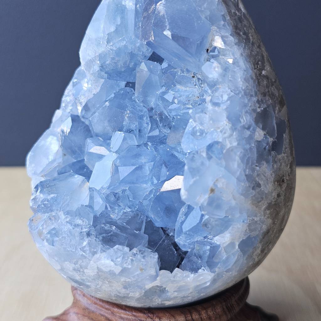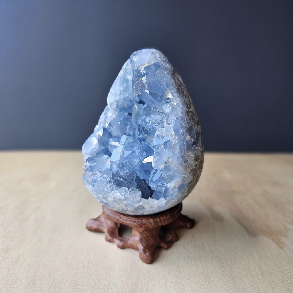 Displayed on a custom heart stand, the piece takes on a presence beyond the ordinary, part collector’s specimen, part décor, and entirely mesmerising. The polished heart shape amplifies celestite’s gentle energy, making it not just a crystal to admire but one that radiates stillness into its surroundings.