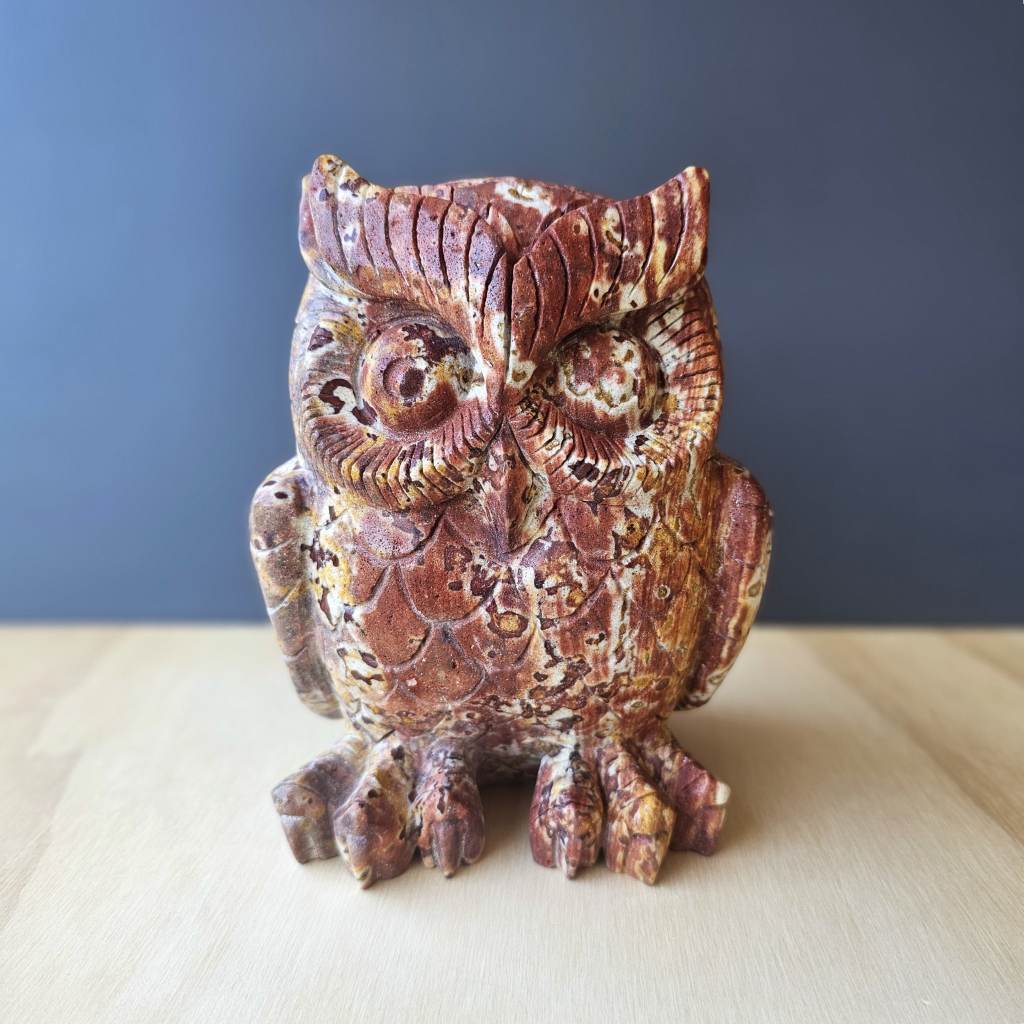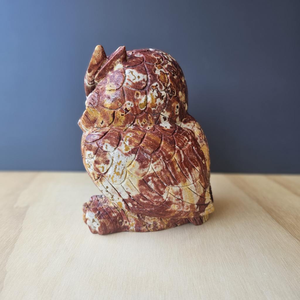 This large colourful brecciated jasper owl carving is a bold expression of geological movement and material strength.