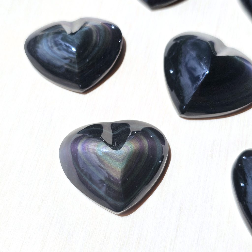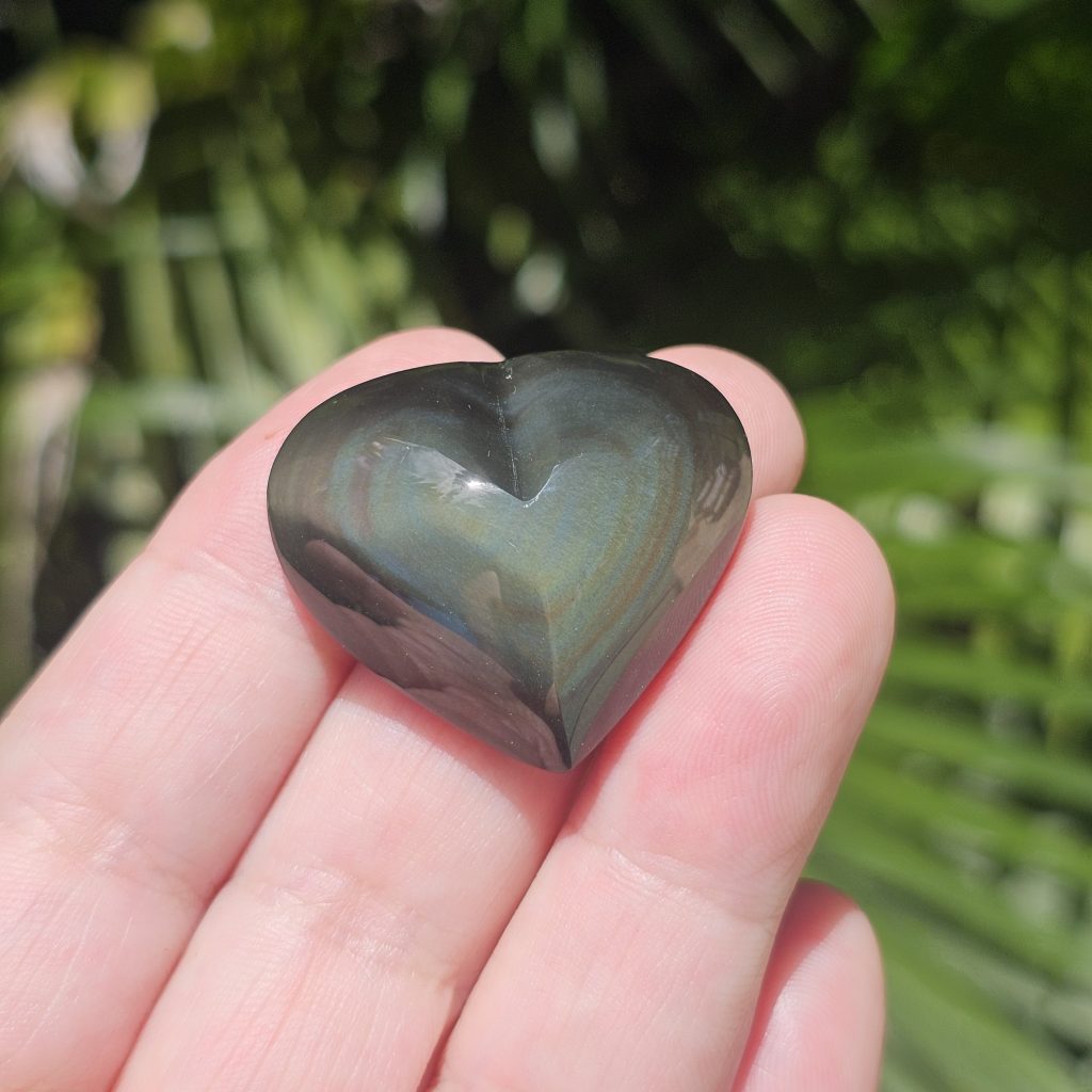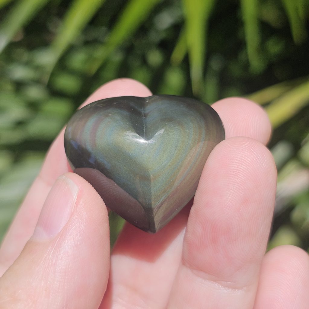 Our small Rainbow Obsidian Hearts may be petite, but they hold serious depth. Carved from natural volcanic glass, Rainbow Obsidian reveals subtle flashes beneath its dark surface, only visible when the light catches it just right. A reminder that softness and strength often coexist quietly.