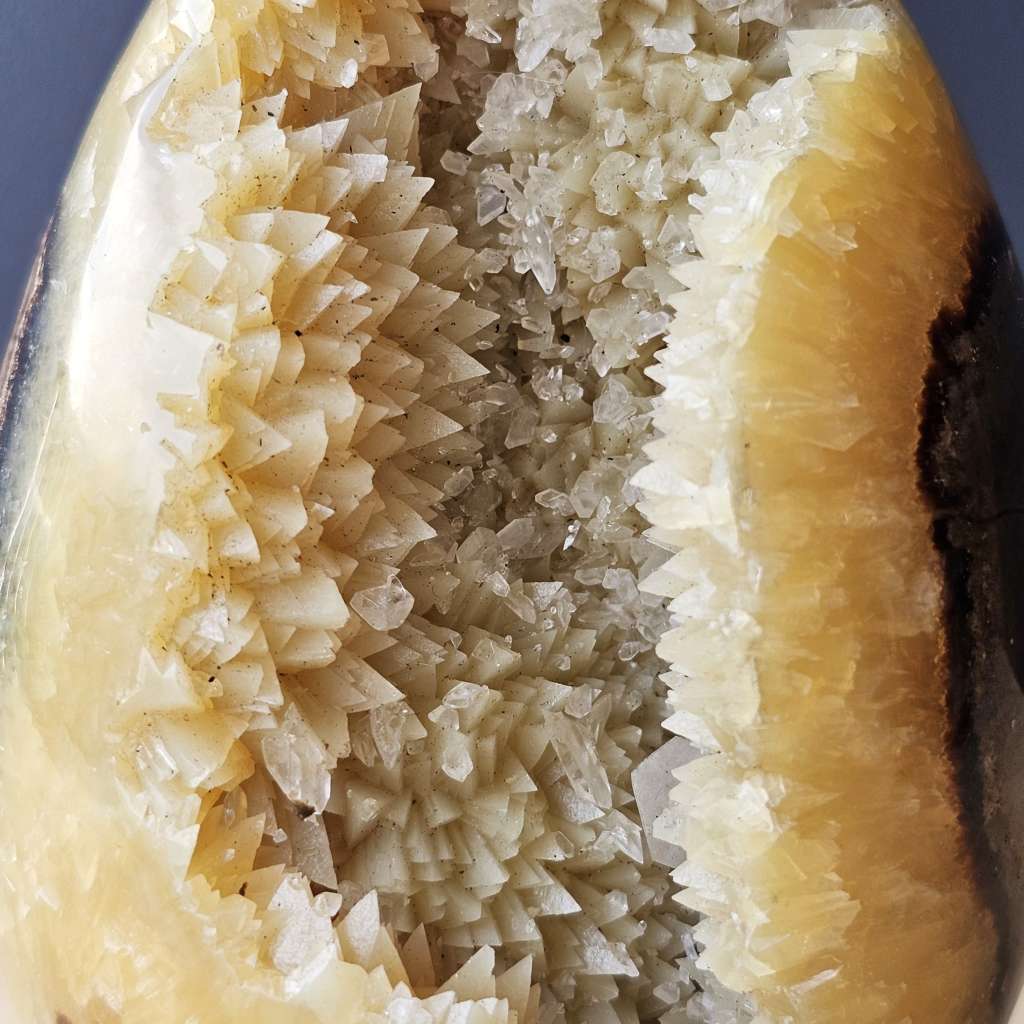 Carved from ancient seabed formations, this Septarian egg displays the extraordinary growth of yellow calcite druzy “teeth” a striking variation that sets it apart from the darker Septarian most collectors know.