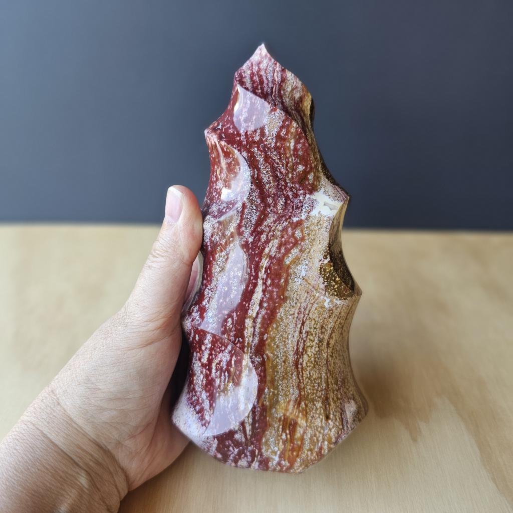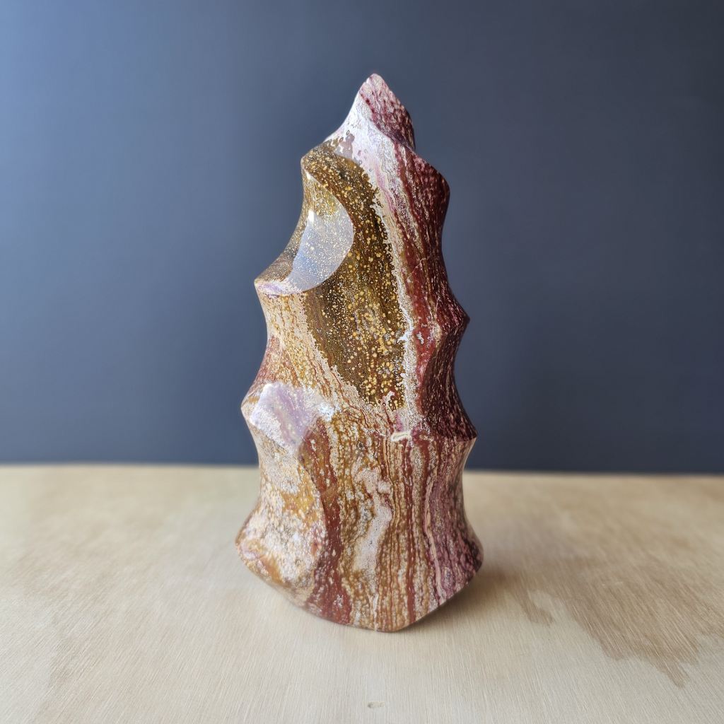 Soft yet commanding, Sacred Rose Flame is carved from Madagascar’s rare pink ocean jasper, its flame shape rising like a beacon of gentle strength. The blush-pink tones flow through the piece with quiet elegance, making it both nurturing and sophisticated.