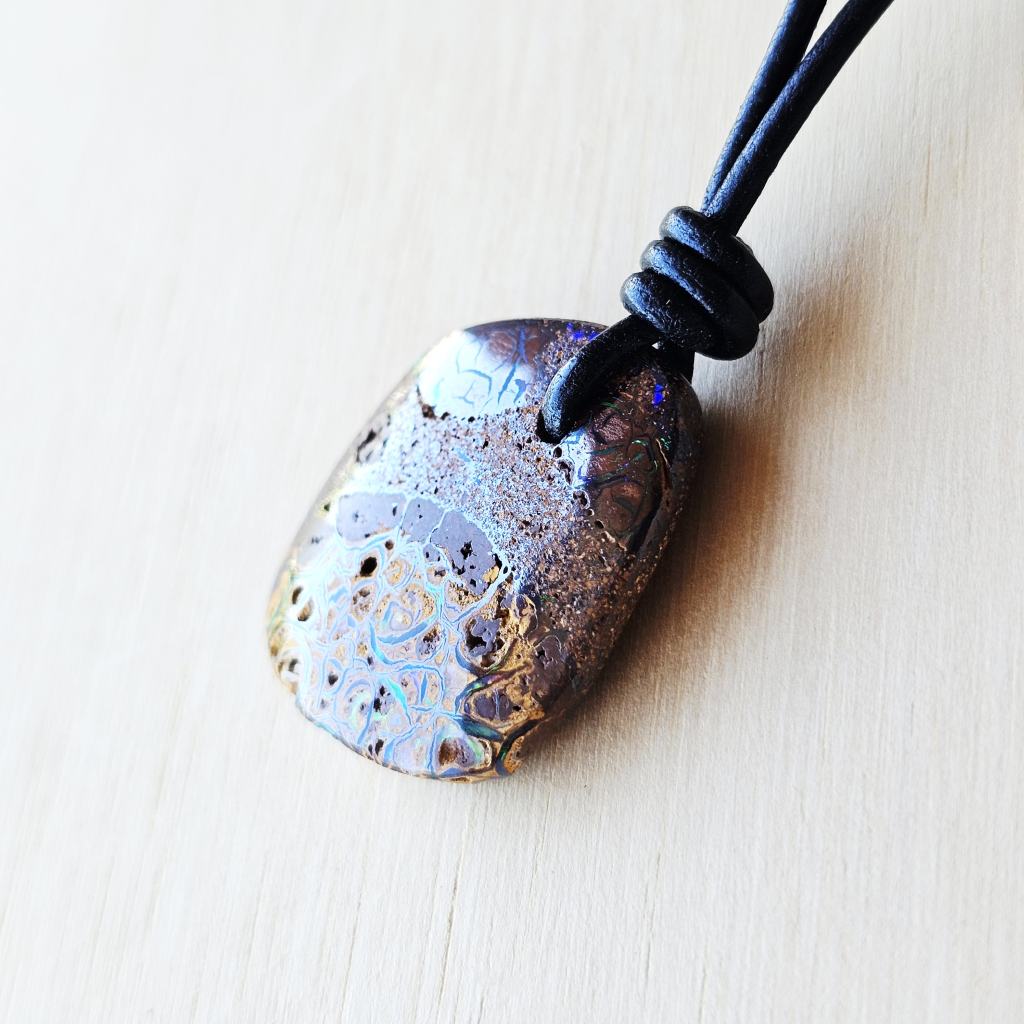 The natural swirls and pockets of colour sit in beautiful contrast against the deep, earthy host rock, creating a pendant that feels both wild and refined. Paired with an adjustable leather cord, the look remains grounded and effortlessly wearable, giving the opal space to shine without ever feeling overstated.