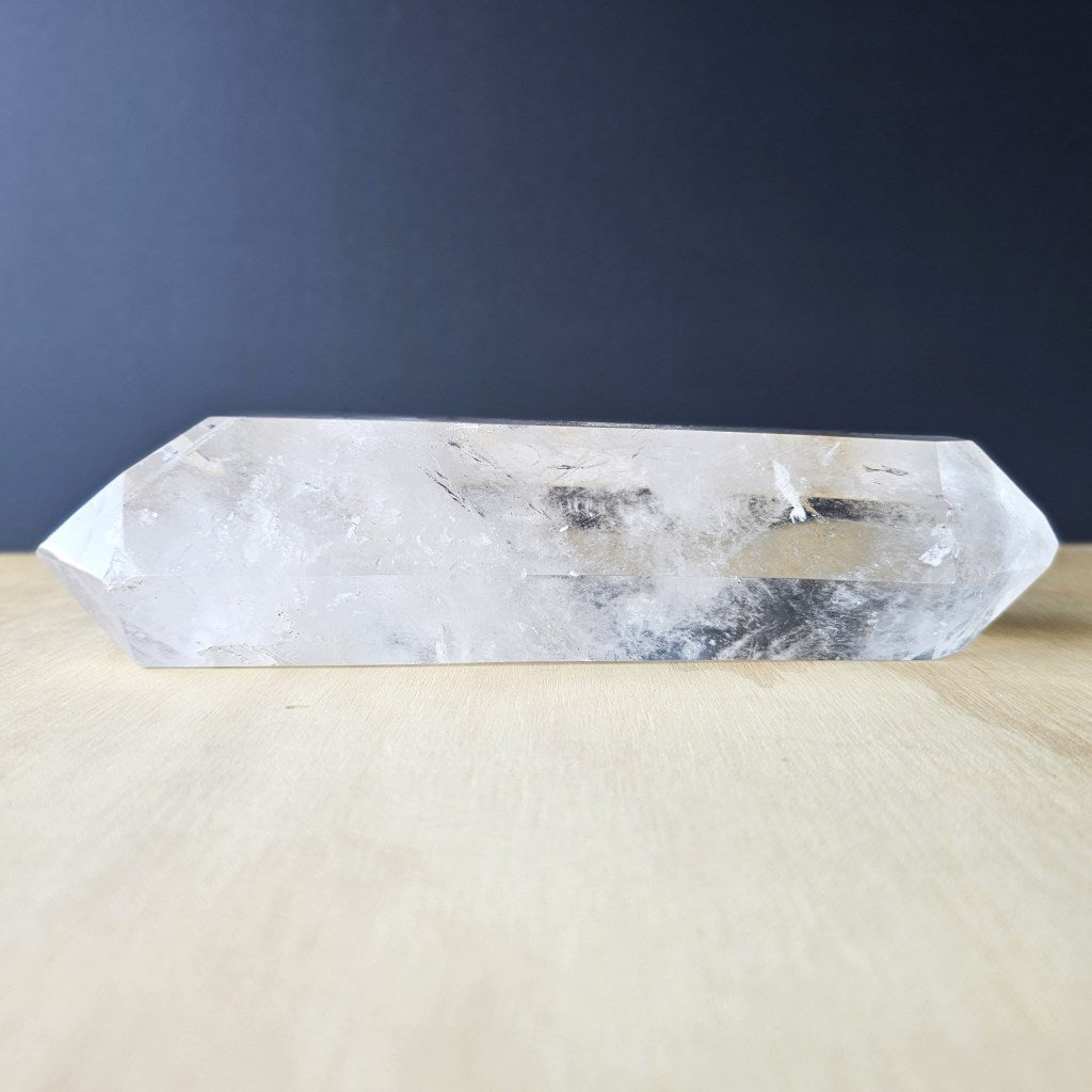 Commanding in size and presence, this double-terminated clear quartz wand is almost crystal clear, yet within it rests something truly extraordinary, a perfectly formed six-sided manifestation crystal. When light passes through the Pyramid Of Light, it reveals itself like a pyramid suspended inside the quartz, a natural wonder that feels both architectural and otherworldly.