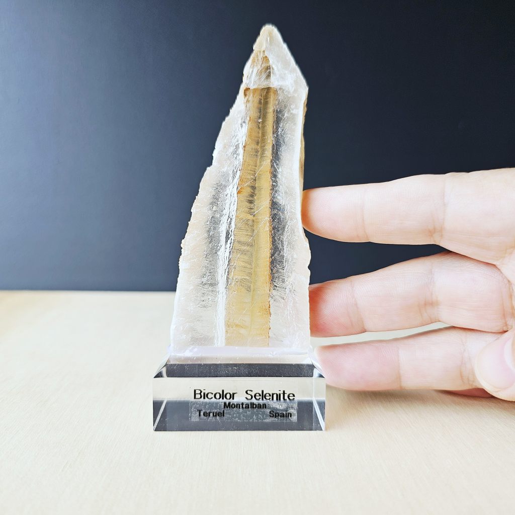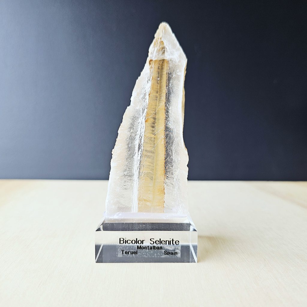 This rare bicolor Selenite hails from Teruel, Spain, a region known for its unique geological formations. Found within ancient sedimentary deposits, this stunning crystal forms through the slow evaporation of mineral-rich waters, allowing gypsum to crystallize into the delicate, fibrous layers that define selenite. Over time, variations in mineral content create the striking bicolor effect, making each piece a rare geological marvel.